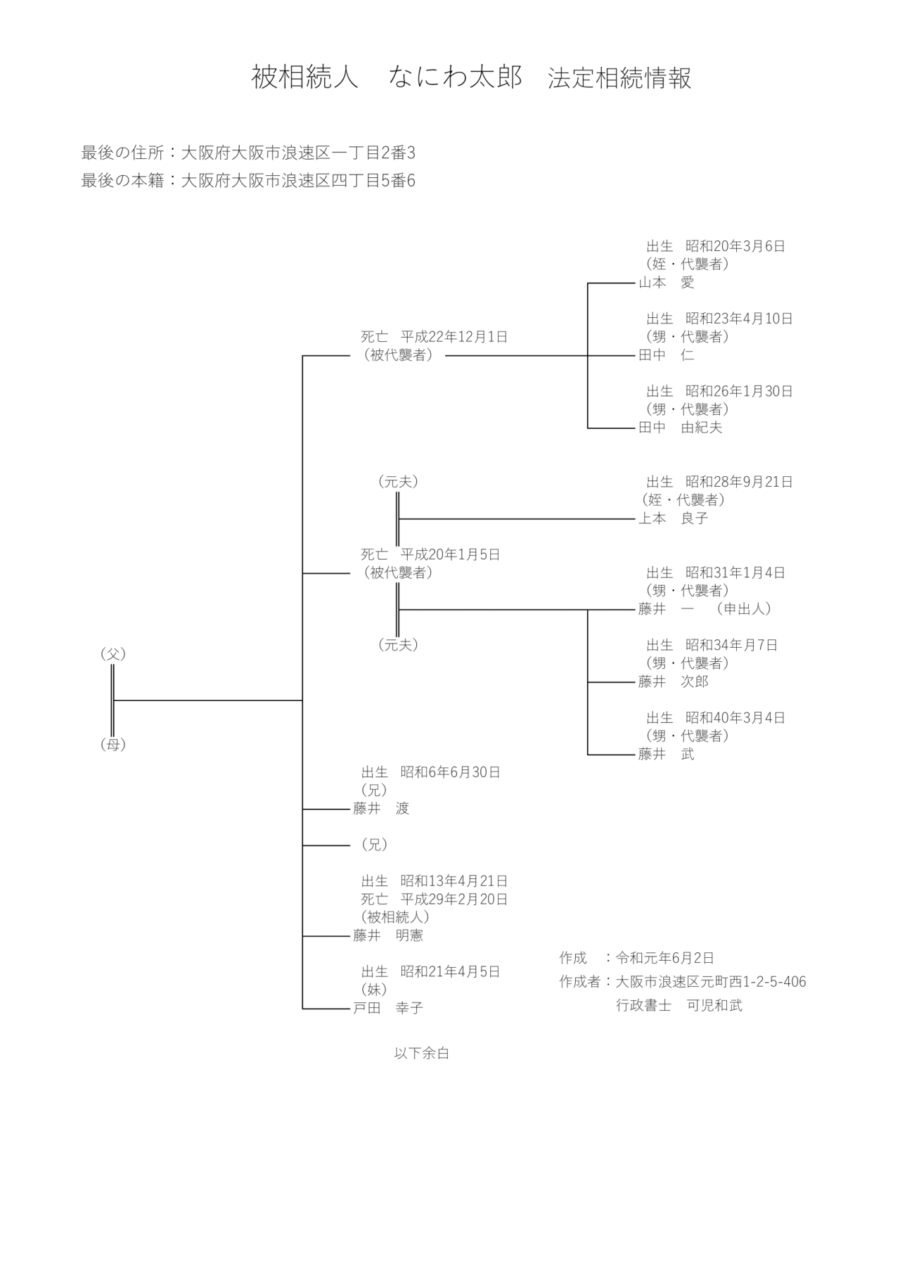 - 申出人(法務局に対して相続人を代表して法定相続情報一覧図作成の申出をする人)の氏名の後ろに“(申出人)”と記載する