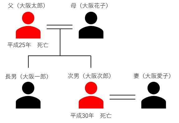 とすると、父(大阪太郎)の遺産分割協議は母、長男、そして次男の相続人である妻とで執り行うことになります。