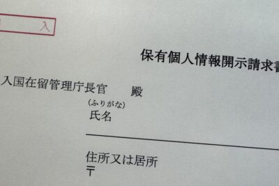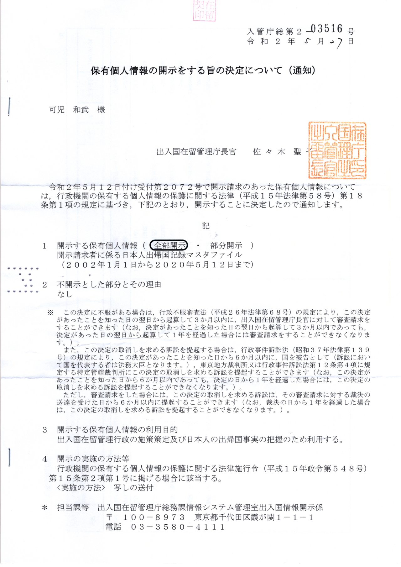 請求先:出入国在留管理庁総務課情報システム管理室出入国情報開示係