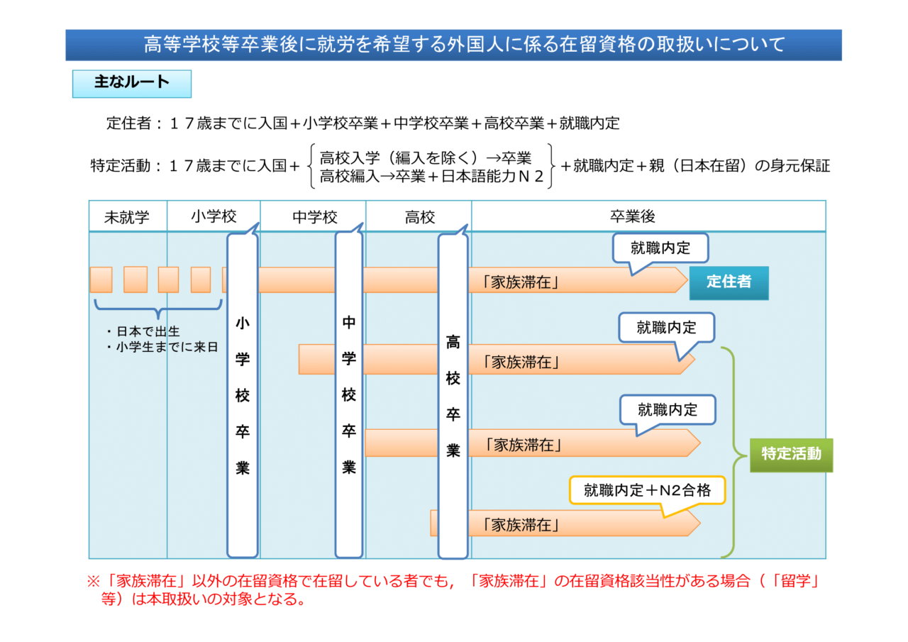 (出典:法務省 「家族滞在」の在留資格をもって在留し,本邦で高等学校卒業後に本邦での就労を希望する方へ)
