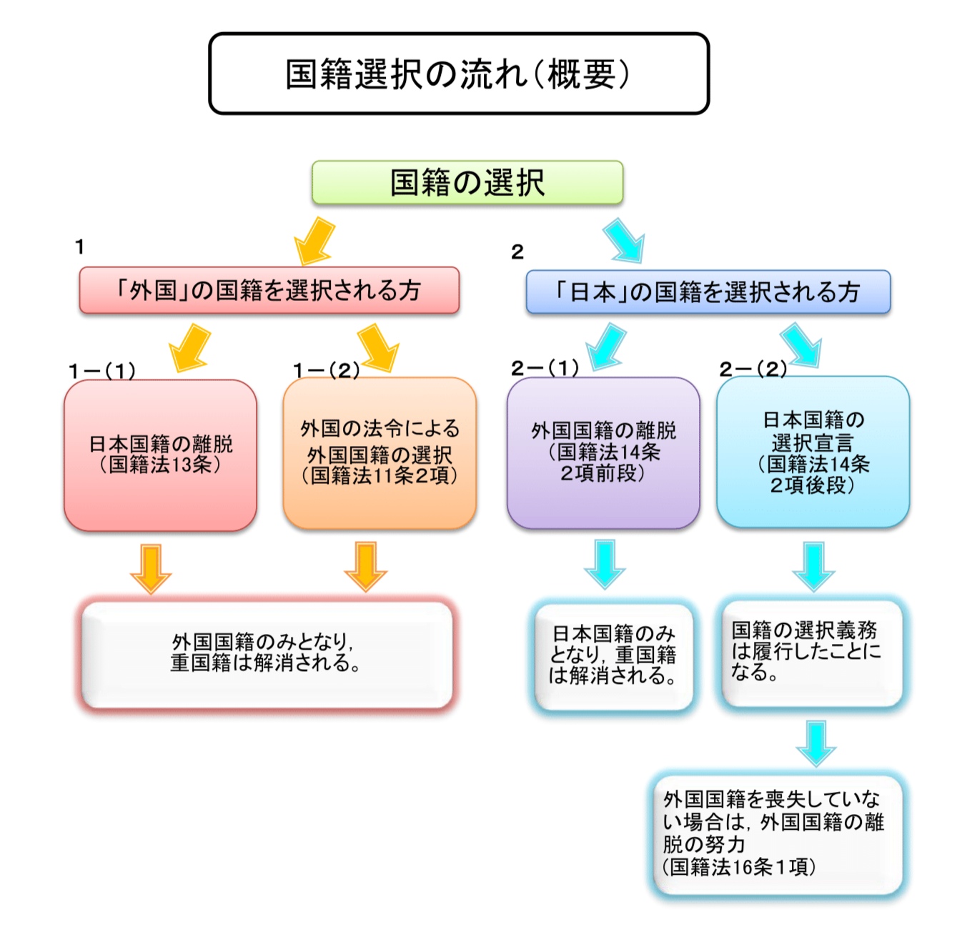 日本では、国籍法により重国籍者(日本国籍と外国籍の両方を有する人)は、一定の期限までにどちらかの国籍を選択することと定められています。