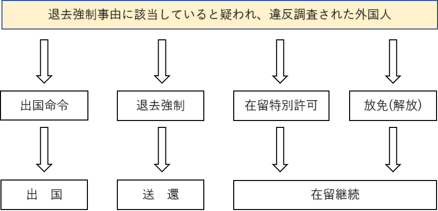 退去強制事由に該当していると疑われ、違反調査された外国人は次の4つのパターンのいずれかの道をたどることになります。