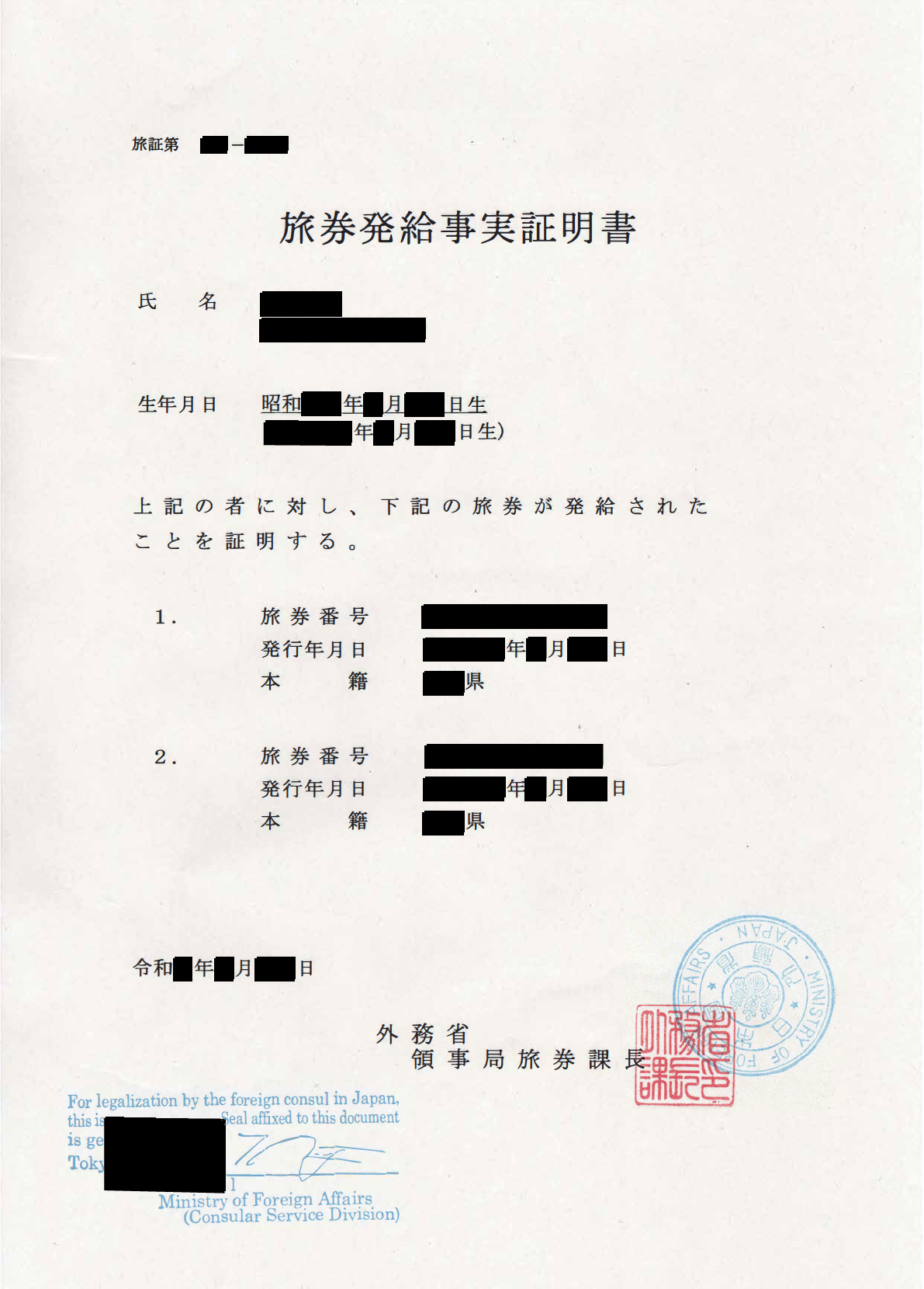 この「旅券発給事実証明書(同一人物証明書)に外務省の公印確認を受けて(さらに必要な場合は領事認証を受けて)提出いたします。