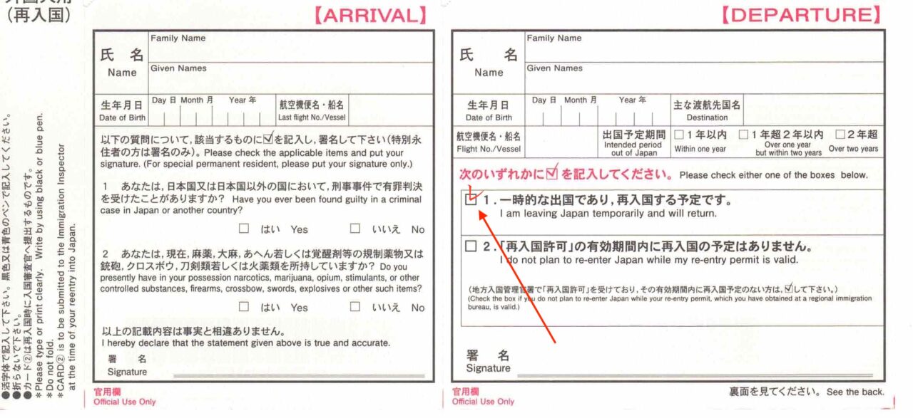 また、再入国出国記録(再入国EDカード)の再入国する予定である旨のチェック欄にチェックをし、これを入国審査官に提示してください。